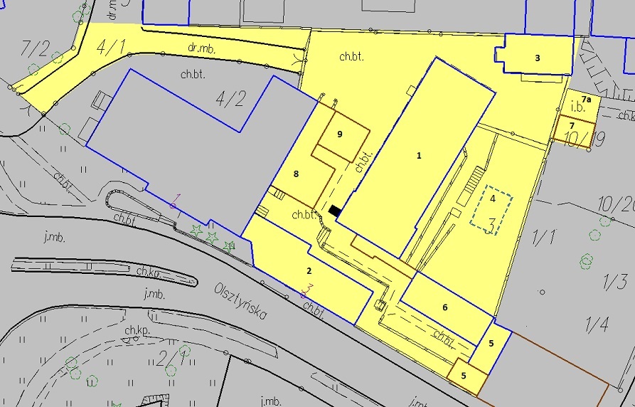 Zgodnie z ustaleniami Uchwały Nr XVIII/139/2000 Rady Miejskiej w Ostródzie z dnia 19 kwietnia 2000 r. (Dz. Urz. Woj. Warmińsko-Mazurskiego nr 32 poz. 484 z 29 maja 2000 r.) w sprawie uchwalenia zmiany miejscowych planów zagospodarowania przestrzennego rejonu ulic Olsztyńska – Gizewiusza w Ostródzie działki nr: 3, 4/1 i 10/19 przeznaczone są na cele usługowe.